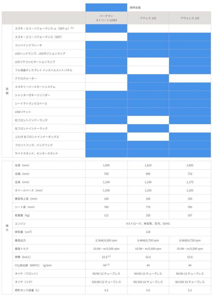 新型「バーグマンストリート125EX」は、前後灯火類には視認性の良いLEDランプを採用し、アイドリングストップシステムを搭載、またエンジンを静かに始動させるサイレントスターターシステムを組み込んだSEP-αをスズキとして初めて採用している。毎日の走りがワンランク上の上質なものに変わるラグジュアリースクーターとなっている。
