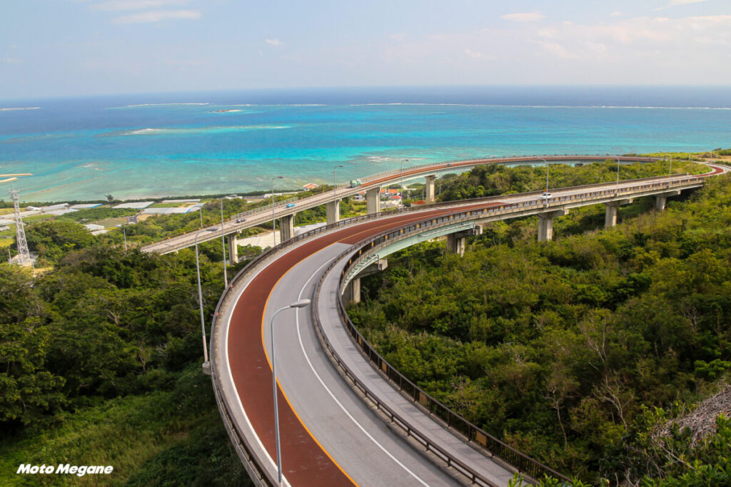 『ニライカナイへの道』とも呼ばれる沖縄県道86号は住宅街を抜けて海へ向かうこともあり人気のカフェも点在している。起点から終点へ走っていくと航空自衛隊知念分屯基地が左手側にあらわれる。そのあたりから『ニライカナイ橋』までが沖縄の森を見ながら進む快走路だ。言わずもがな、この道一番の絶景ポイントは『ニライカナイ橋』である。森を抜けた橋の先に沖縄の美しい海が広がっている。