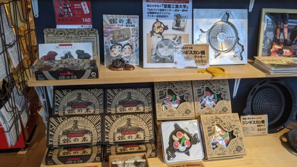 現在、室工大オリジナルジンギスカン鍋をモチーフにした「ジンギスカン鍋クッキー」も販売中。割れやす形状のため市内のみの発売でしたが、最近ではパッケージを改良して「東室蘭駅内の四季彩館」や「道の駅みたら室蘭」以外に「新千歳空港」でも販売しています。バイクでの持ち運びもOKですよ。