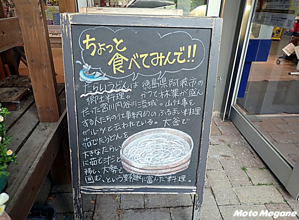 道の駅が面するR318は吉野川市と東かがわ市を結び、四国山間部から香川県へ抜けるルートとなっている。山間部を走るこの道は景色も楽しめる走りやすい道。その途中にある道の駅では名物たらいうどんを楽しめ、自然の中リフレッシュできる休憩場所として、立ち寄りスポットに最適だ。