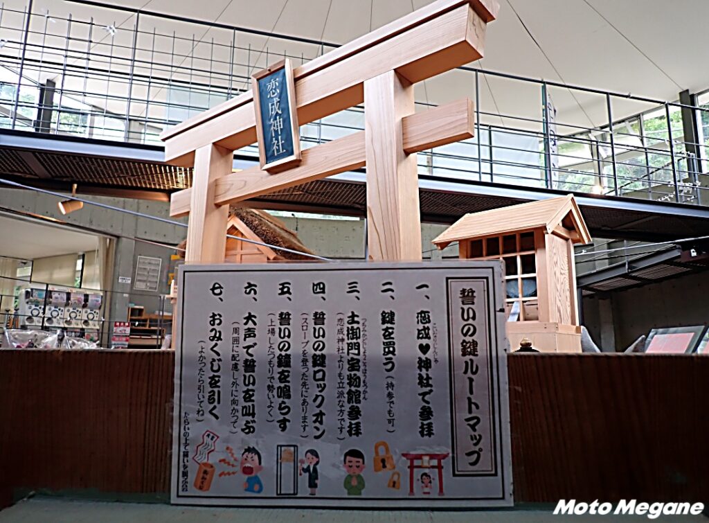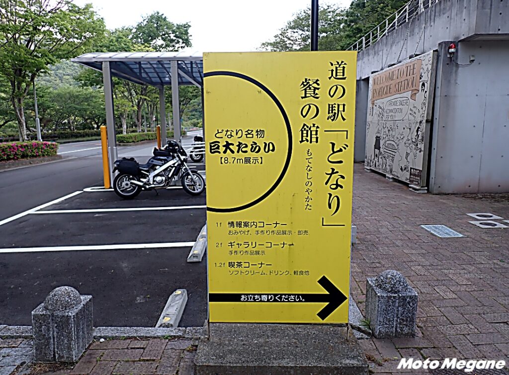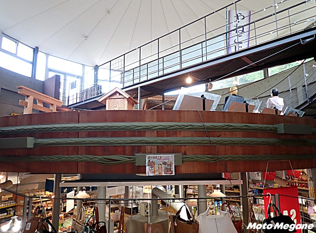 道の駅施設はコンクリートの円柱状の形が特徴的で「餐(もてなし)の館」という名が付けられている。中に入ると、約8.7mの巨大なたらいが展示されている。これは地元の郷土料理の「たらいうどん」に使われる「たらい」で、巨大たらいは円柱状の建物にすっぽりと収まり、1階部分の天井の役目も果たしている。らせん状のスロープを上がると、たらいの中に「恋成神社」が建っており、神社には自然に形成されたハート型の石がご神体に祀られていて、恋愛成就のちょっとしたパワースポットにもなっている。