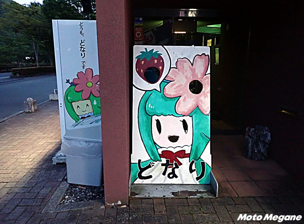 道の駅看板には阿波市のマスコットキャラの「あわみちゃん」が描かれている。あわみちゃんは鳥ウグイスの妖精で、名物の「たらいうどん」の白いドレスを着て、頭にはお気に入りのコスモスの花飾りをつけている。自動販売機にもあわみちゃんラッピングがされているほか、手作りと思われるあわみちゃんの顔はめパネルも置かれていた。