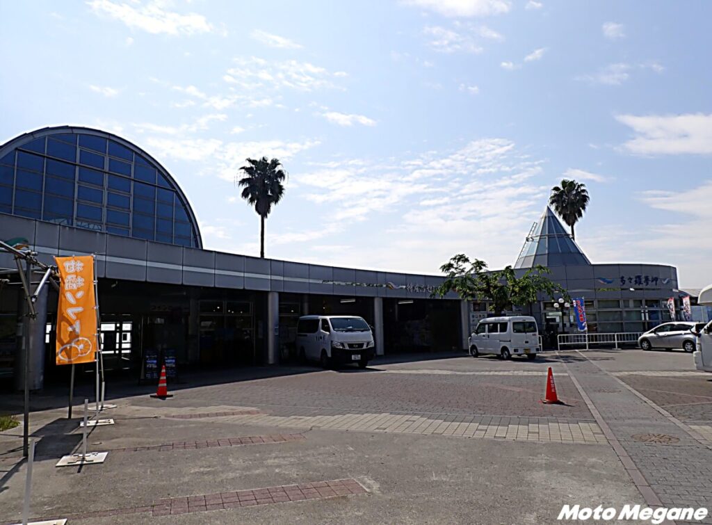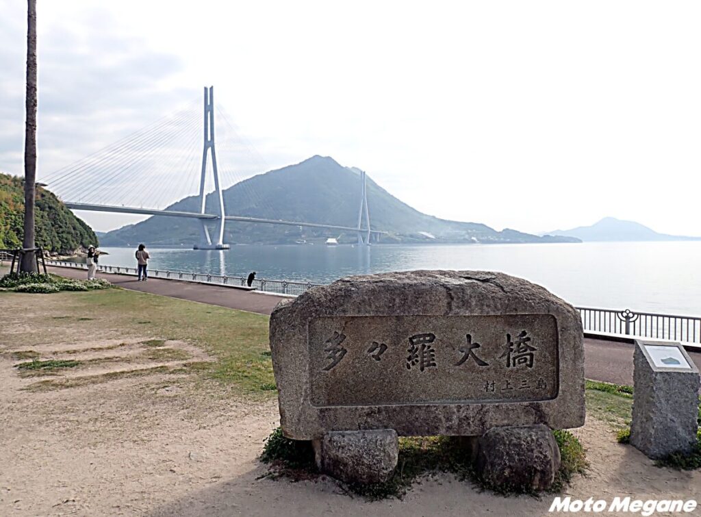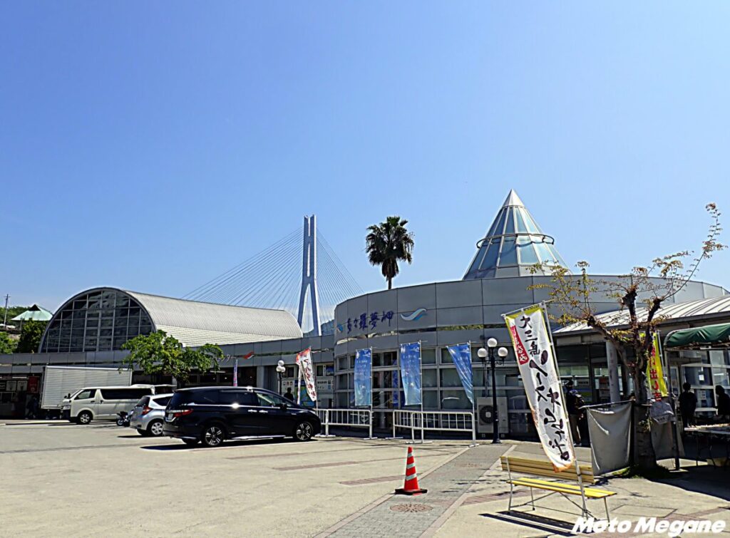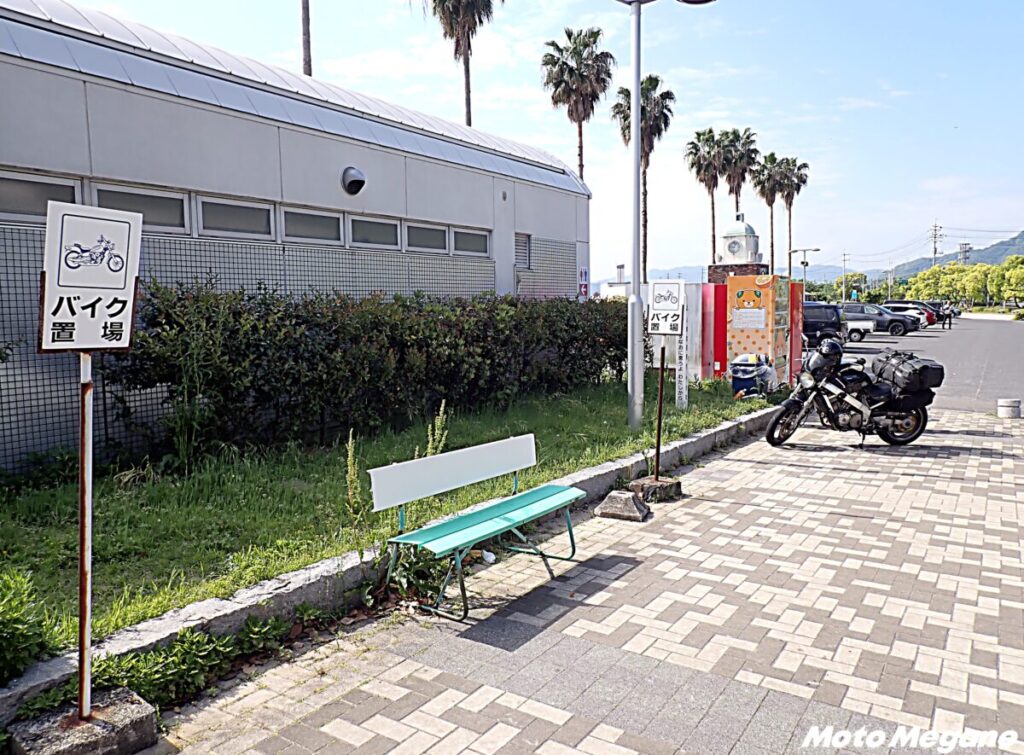 『道の駅今治市多々羅しまなみ公園』は西瀬戸自動車道の大三島ICを降りてすぐ、R317沿いに位置。駐車場は広々としていて、バイク用の駐輪スペースも用意されている。建物裏側は海に面しており、道の駅からは美しい瀬戸内海や国内最長の斜張橋の多々羅大橋を一望するビュースポットとなっている。海に沿って遊歩道も整備されている。