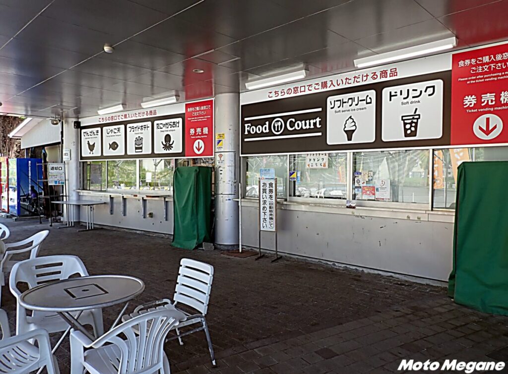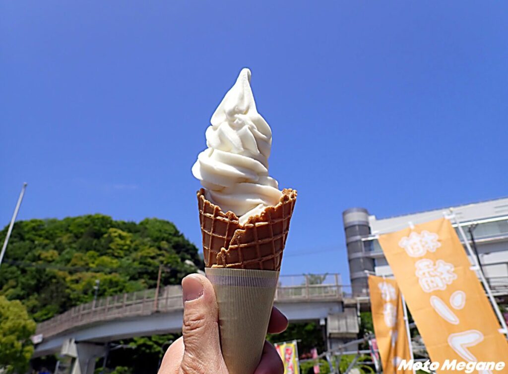 フードコートでは、みかんや大三島のレモンを使った「島レモンソフト」などご当地の柑橘ソフトクリームを味わえる。島レモンソフトはシャーベット系のソフトクリームで、さっぱりとしているので、暑い日のツーリングにおすすめ。