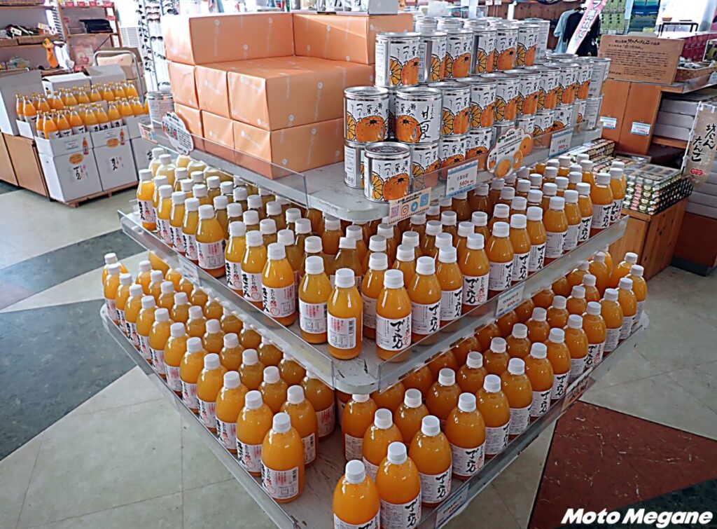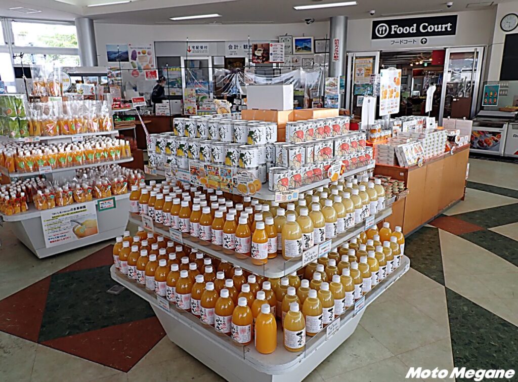農産物直売所では1年を通してさまざまな柑橘類を販売。12~3月が最も旬の時期で、さまざまな品種の柑橘が店頭に並ぶ。愛媛果試第28号(南香+天草)など、愛媛県オリジナルの品種も揃う。特産品センターには柑橘を使った多彩な商品が揃うので、お土産にもぴったりだ。