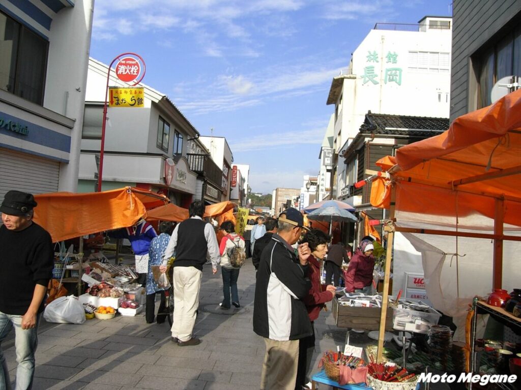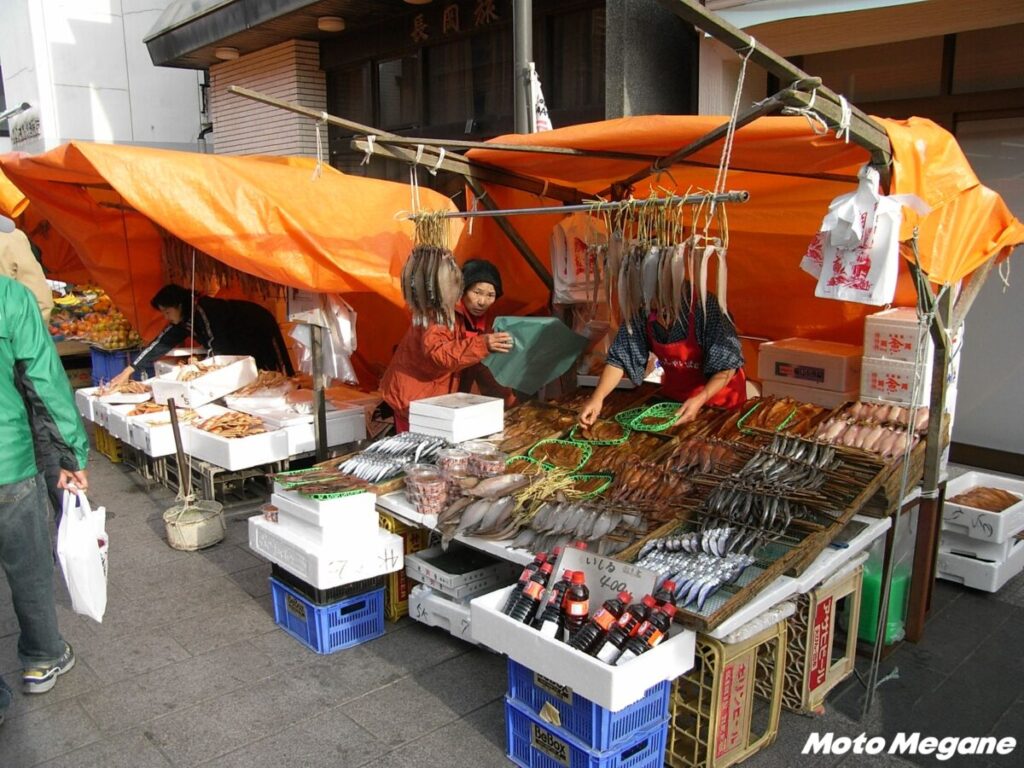 千葉・勝浦の「勝浦朝市」、岐阜・飛騨高山の「宮川朝市」と並んで日本三大朝市の一つ。歴史は古く1000年以上続いており、漁港近くの「朝市通り」と呼ばれる約360mの商店街に、200以上の露店が並ぶ。農産物、魚介類、加工海産物、工芸民芸品など、さまざまな品を販売している。