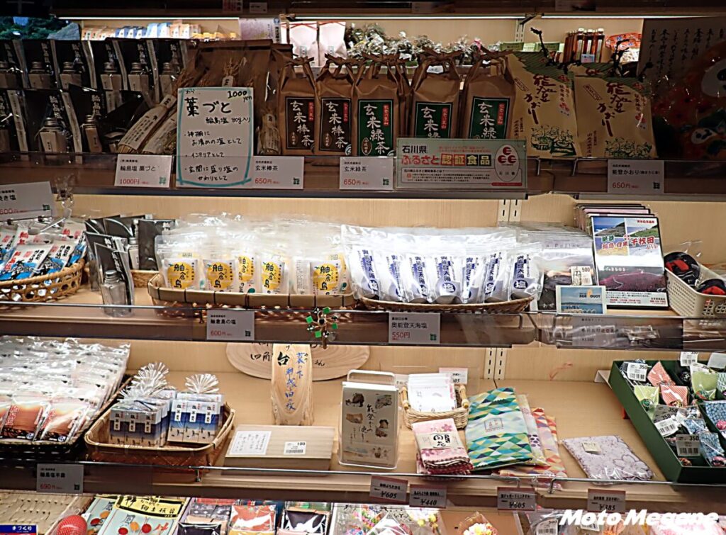 売店では、千枚田の棚田米、地域のお菓子、輪島の特産品や工芸品などを販売。ポン菓子や輪島塩、手作り味噌や梅干しなどの加工品、地酒など多彩な品揃え。中でも輪島名物の「えがらまんじゅう」が大人気。