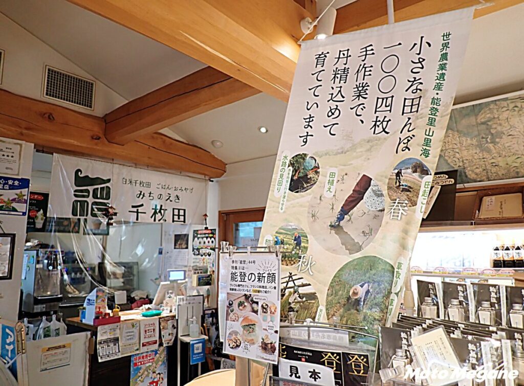 道の駅施設には、売店と食堂が入る。隣には「白米千枚田」があり、展望スペースから日本海と棚田を見下ろせる。