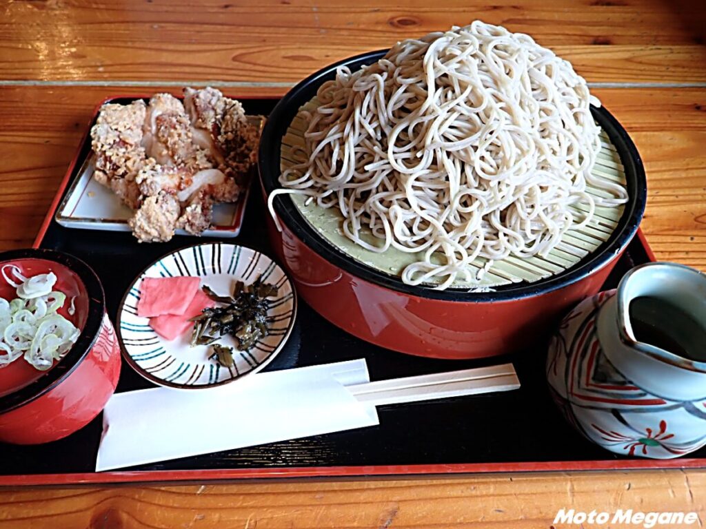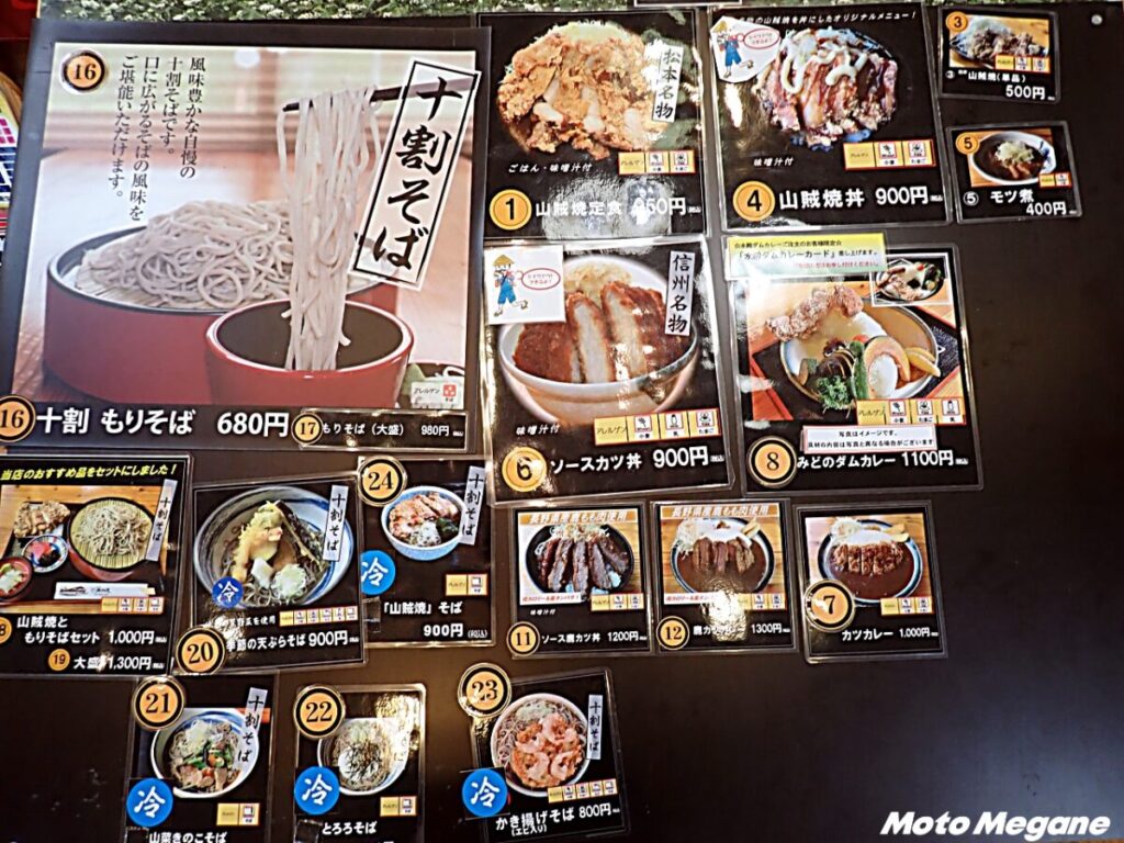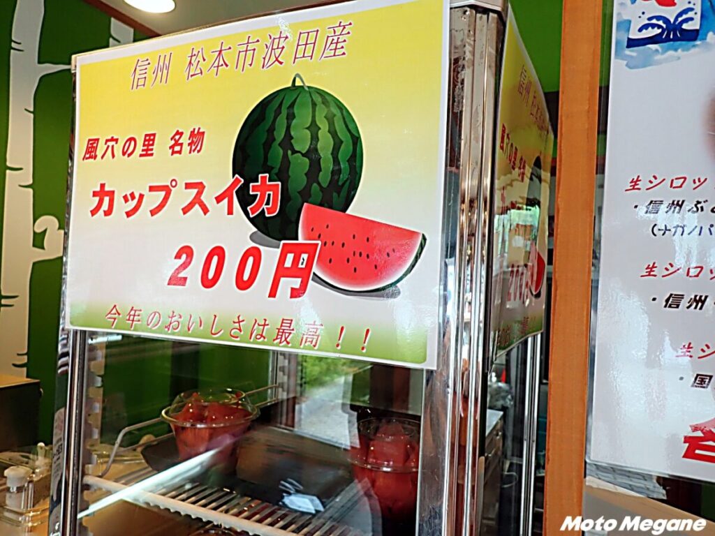 食事処で一番人気メニューは自家製の十ほかにもほかにも松本名物の山賊焼きや信州のご当地グルメソースかつ丼を味わえる。外にある「森のカフェ」では地元産の花豆やエゴマを使ったパウンドケーキ、おやきやソフトクリーム、コーヒーなどをテイクアウトできる。夏場は近隣で採れたスイカやかき氷も販売され、暑い日のツーリングに食べると最高だ。