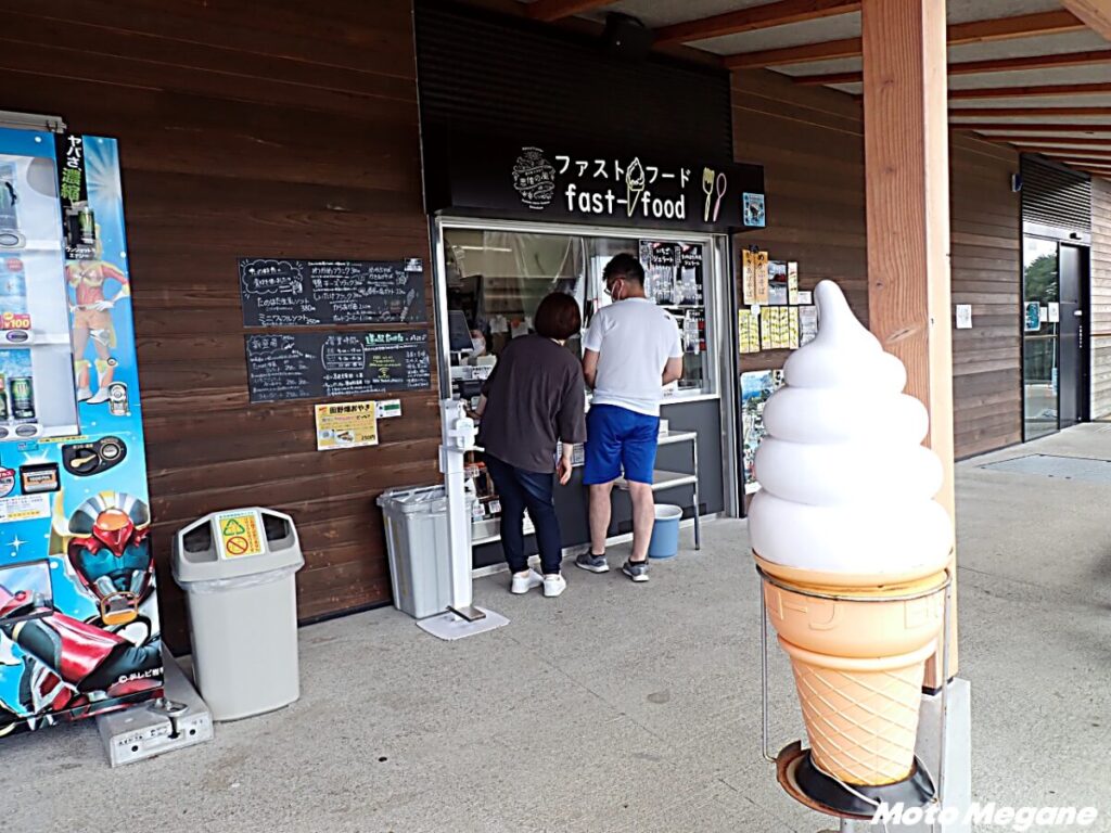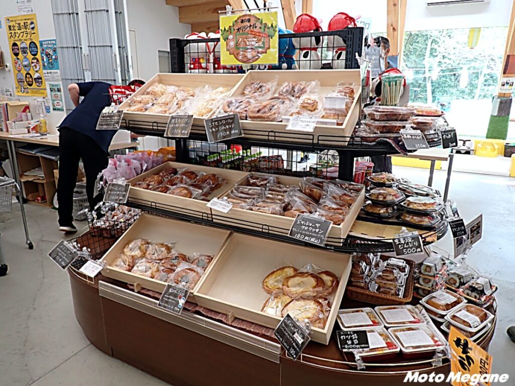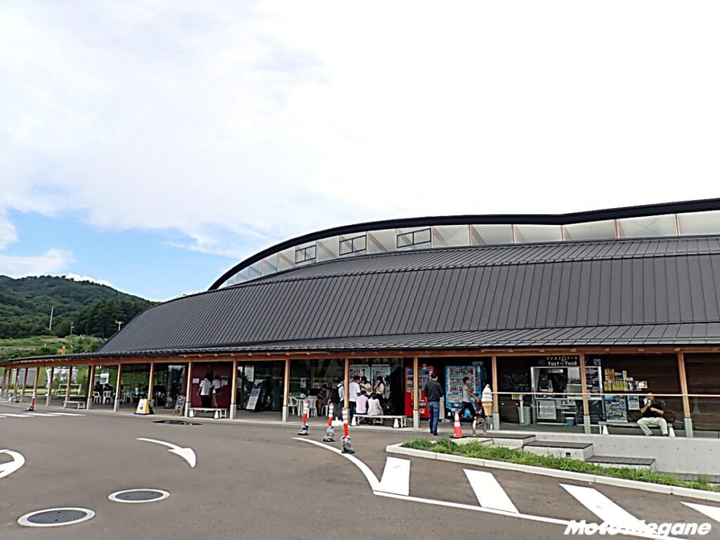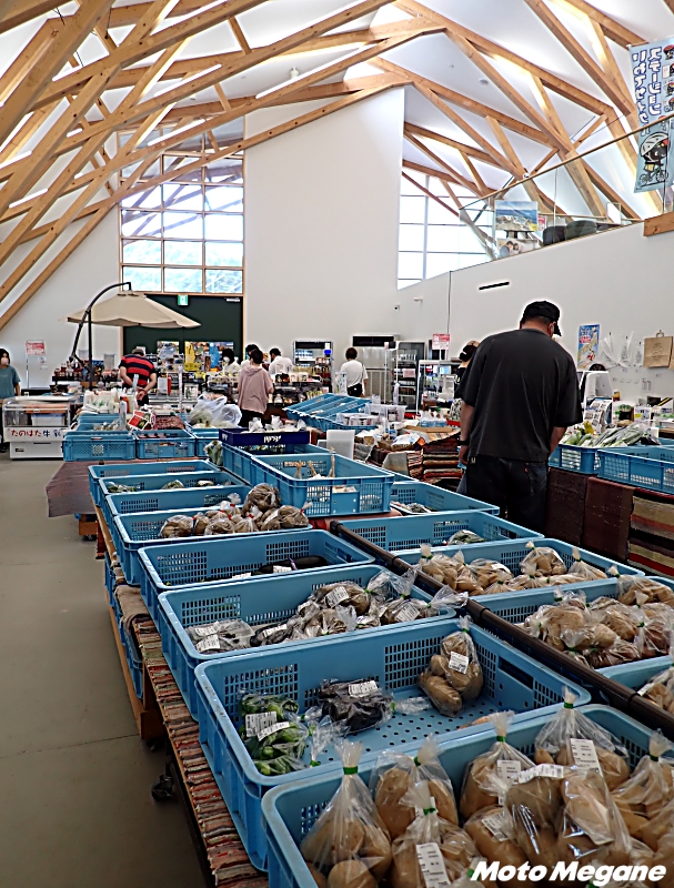 天井が高く広々とした館内には、物産・産直コーナー、食堂が入り、2階部分には休憩スペースが設置され、購入した商品などはここで食べることができる。屋外ではファストフードの売店が営業。特産品を販売する自動販売機も設置されており、24時間購入が可能だ。