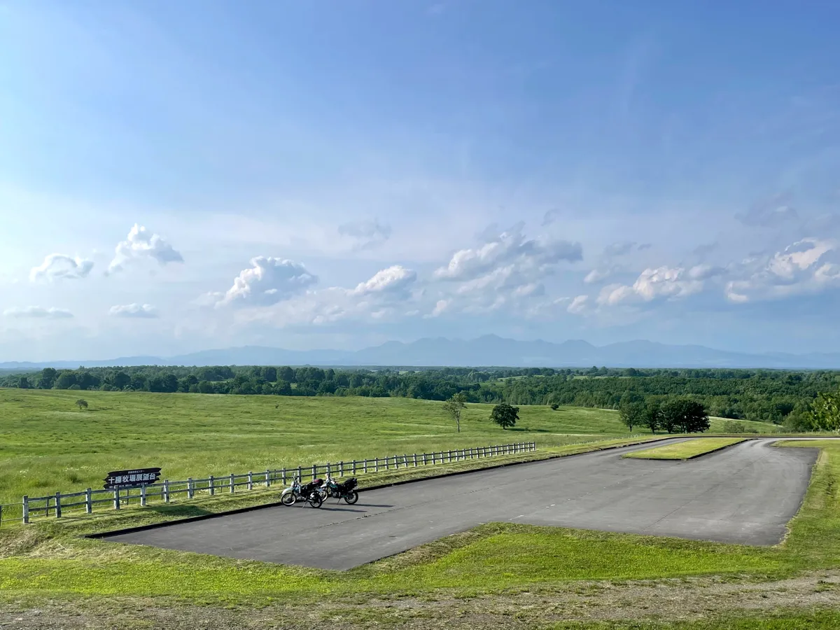 そして、最後の力を振り絞って坂を上り切ると…突如全面舗装の無駄に広い駐車場が出現するので、おもむろにバイクを止めて辺りを見回すと「北海道!十勝!」と聞いて誰もが思い浮かべるであろう…広がる大草原と日高山脈の絶景がライダーお出迎えしてくれます!