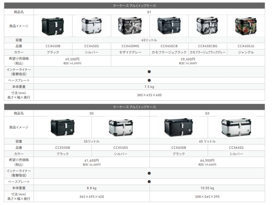 株式会社シージェイは、シンガポール発バイク用トップケースブランドクーケースから、アルミトップケースを発売した。用途に合わせて選べる45L、55L、65Lの3サイズをラインナップ。インナーライナーと荷掛けレールを標準装備し、付属のベースプレートを車両リアキャリアへ取りつければ、車両からのトップケース取り外しが簡単に行うことができる。また、洗練されたデザインと高剛性を持ち合わせているため、バイク旅やキャンプなどのツーリングシーンにおすすめのアイテムだ。