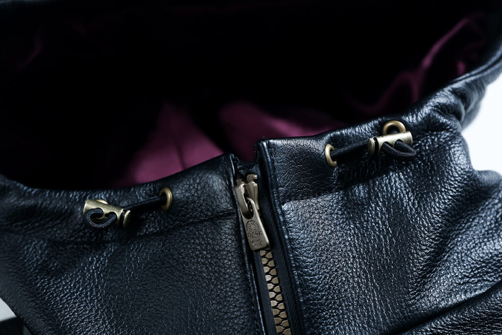 また、革だけでなくジッパー部分からの浸水も想定し、ジッパーは全てYKK特注にて撥水ジッパーを装着。急な雨が降ってきたら、フードを被れるような設計になっています。
