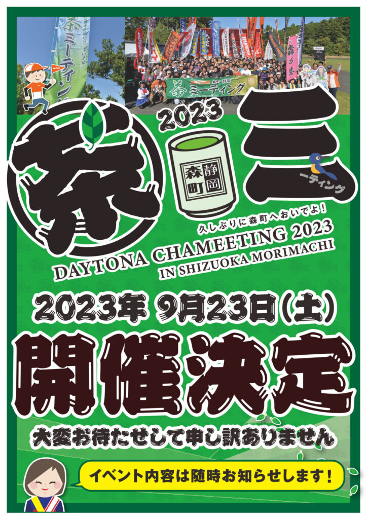 2019年の「第11回」以来4年ぶりとなる「第12回 DAYTONA森町・静岡 茶ミーティング」を2023年9月23日(土)に開催することを決定いたしました。