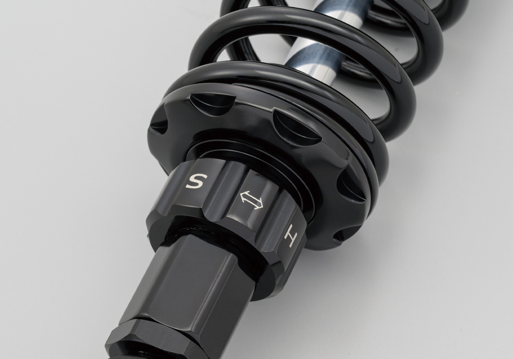 純正よりローダウンしながら、純正以上の乗り心地とコーナーリング性能、ギャップ走破性を両立したアジャスタブルリアショック。車高は無段階で調整可能で、30mmショートのローダウンスタイルから15mmショートでちょい下げまで様々なスタイルにマッチします。オールアルミ削り出しのボディは、スポーティな印象を与えるだけでなく、軽量化にも貢献します。
