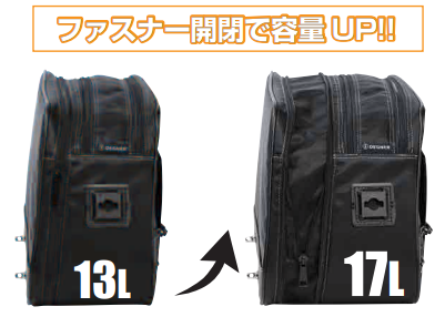 旅先などで荷物が増えても安心。ファスナー開閉によって最低 13Lから17Lまで容量が可変します。