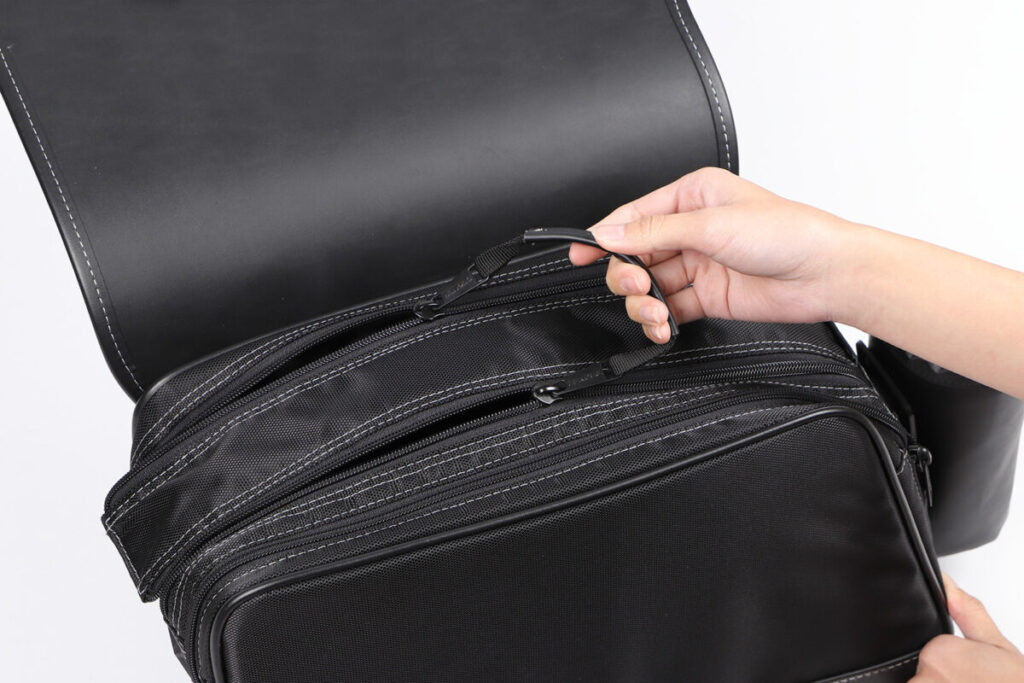 片手で簡単に開閉でき、開口部を大きく確保できるダブルファスナーは、使いやすさにこだわった仕様。