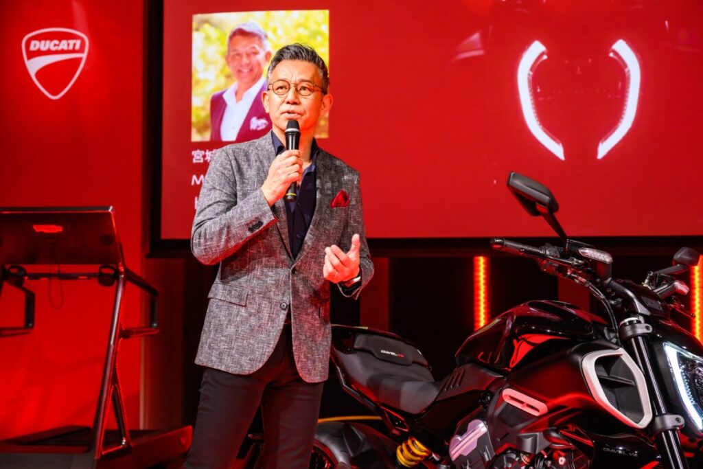 新型ディアベルV4の製品プレゼンテーションは、MotoGP解説者でドゥカティ アンバサダーの宮城光氏が実施、「ディアベルはマッスルクルーザーであり、パワフルなネイキッド、遠くからでもわかるドゥカティならではの存在感がある。現在私が乗っているムルティストラーダV4と同じV4グランツーリスモエンジンを新たに搭しています。前モデルのL型2気筒エンジンよりも前後長が短く、エンジン高も低いため、エンジン幅はわずかに大きいだけだが、そのコンパクトなエンジンを最大限に強調しているのが、新型モノコックフレームである。スイングアーム、大胆なデザインのホイール、4本のエンドコーンを持つマフラー、V4エンジンを見せつけながらも筋肉質な美しさを持っている、新型ディアベルV4はまさにドゥカティらしいモデルだと思います」と紹介しました。