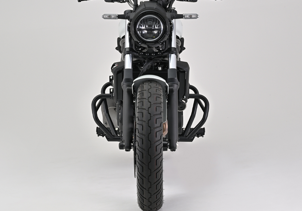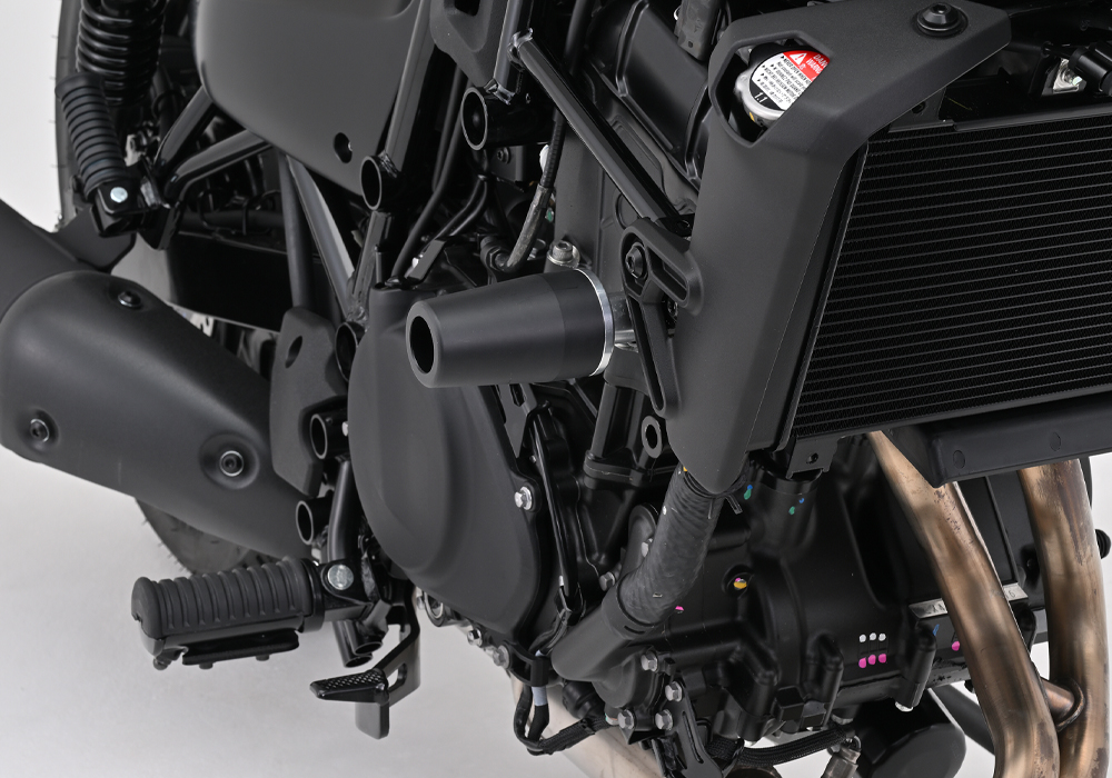 ELIMINATOR/SEのフレームデザインをオマージュしたパイプレイアウト。転倒時の車両のダメージを軽減。取り付けのしやすい左右セパレート構造でマフラーを取り外すことなくエンジンガード装着が可能。剛性UPのため、左右を連結するビームを採用。