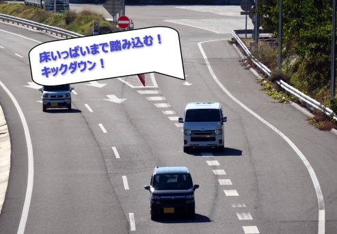 操作例として「高速道路の加速車線」「前方に長い登り坂が現れたとき」が考えられます。CVT車以外の四輪車の、アクセルペダルを床いっぱいに踏み込んだときに発生する「キックダウン」を手動で行うイメージの操作方法です。