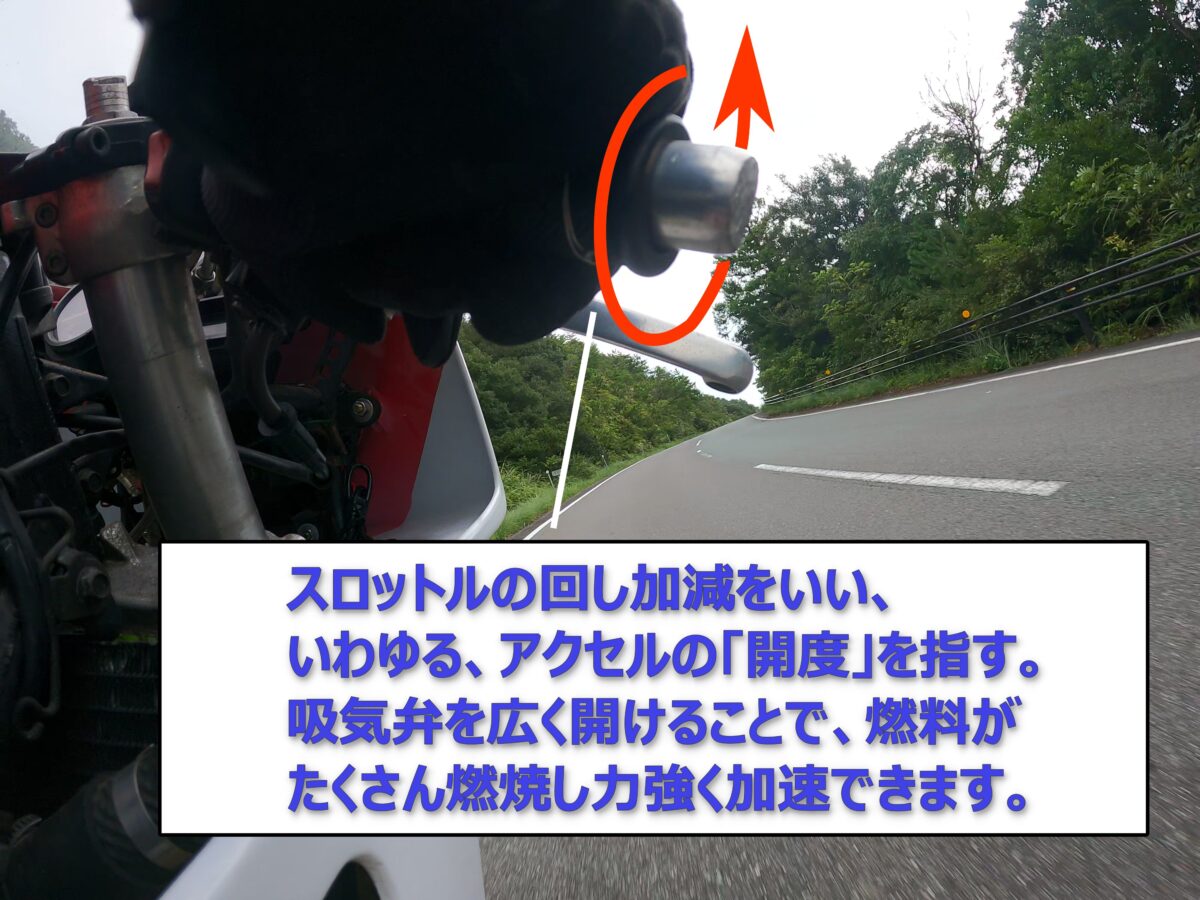 「スロットルを回す」という、そのままの意味を持つ一方、エンジンを回す……具体的にはエンジンパーツのひとつである「クランクシャフト」をより早く回転させる操作を指し、まわすと強い加速感が伴います。つまり、高速域での運転をする前段階の操作法といえます。また「アクセル開度」の理解は、キャブレターのセッティングを出すために不可欠な知識といえます。
