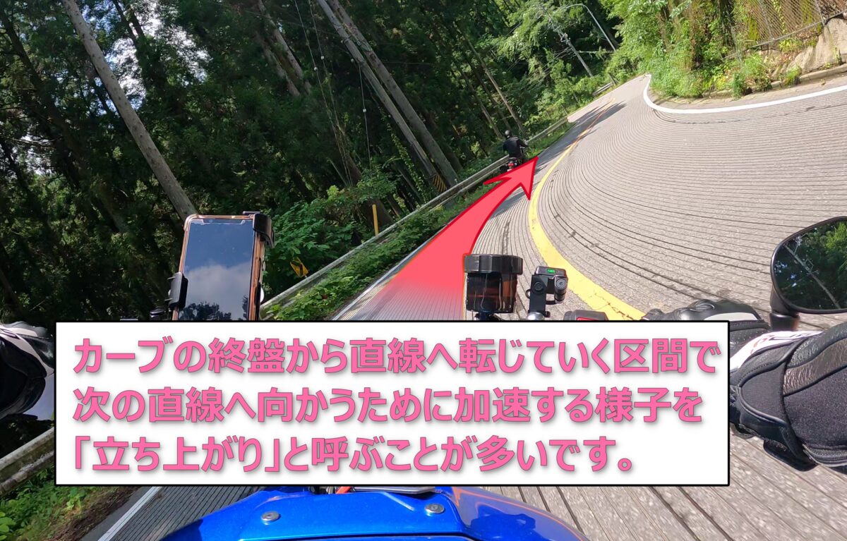立ち上がりとは、曲線路(カーブ)終盤からその後に続く直線路(ストレート)へ続く接続部分を指す事が多く、これにあたる場所で「回す」「引っ張る」操作を加えることで、バイクの加速感や鼓動感がライダーに直感的伝わるため、「バイクは楽しー!」と思える大切な区間といえます。重ね重ねになりますが、「立ち上がりの加速感」は、ライディングの醍醐味を感じるためのエッセンスといっても過言ではないでしょう。