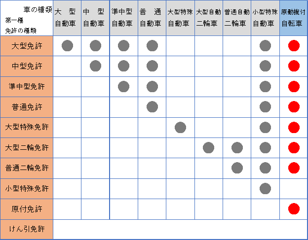 まずは下記の一覧表を見ていただき、ご自身の免許の条件と照らし合わせてみましょう。