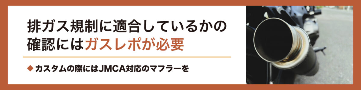 しかし、マフラーの交換については海外マフラーや公道走行不可のレース用マフラーなどを装着すると騒音規制に適合しなくなり、警察から指摘される可能性もあります。マフラーをカスタムする際は、バイクの使用目的に合わせてJMCA公認・車検対応のモノを選べば間違いはないでしょう。