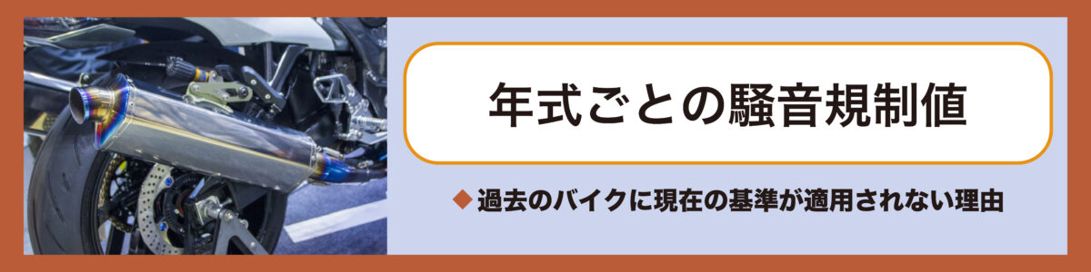 当時の法的根拠に基づいて流通を許されたバイクを、後出しの法律により乗れないようにしてしまうと、国が国民の権利を奪う形になってしまいます。そのため、過去のバイクには過去の規制が適用され、最新の基準は最新のバイクにのみ適用されます。