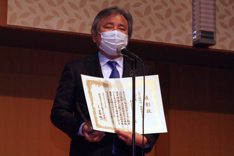 授賞式では能楽師の大倉正之助氏による太鼓の演奏からスタート。自由民主党オートバイ議連会長・逢沢一郎議員(写真左)の祝辞や、一般社団法人日本二輪車文化協会・吉田純一会長(写真右)による挨拶が行なわれ、さらには選考員も努めているファッションデザイナーの菊池武夫氏はビデオレターで開催の祝辞を述べられました。