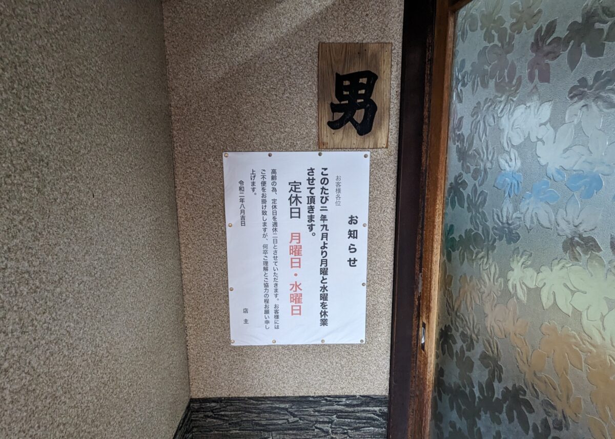 ライダーハウスに併設していた「松乃湯」が廃業したため、お風呂は他を探すしかありません。一番近いのはバイクで約5分の場所にある「五月湯」です。岩見沢には多数の銭湯がありましたが、軒並み廃業したため、市内で現存する唯一の銭湯です(スーパー銭湯を除く)。内部は写真撮影できないのでイメージしてみてください。