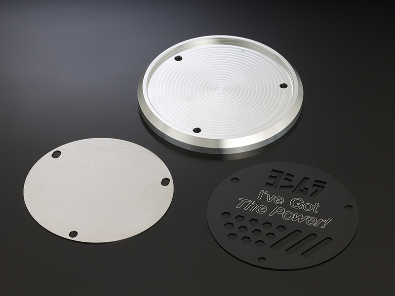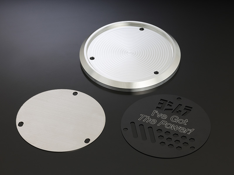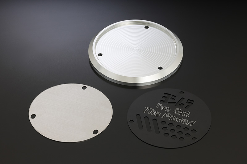 アルミ削り出しベースプレート、ステンレスのヘアラインプレート、ブラックアルマイトプレートのトリプルコンビネーションにより、コントラストが映える立体的な表情を生み出しています。