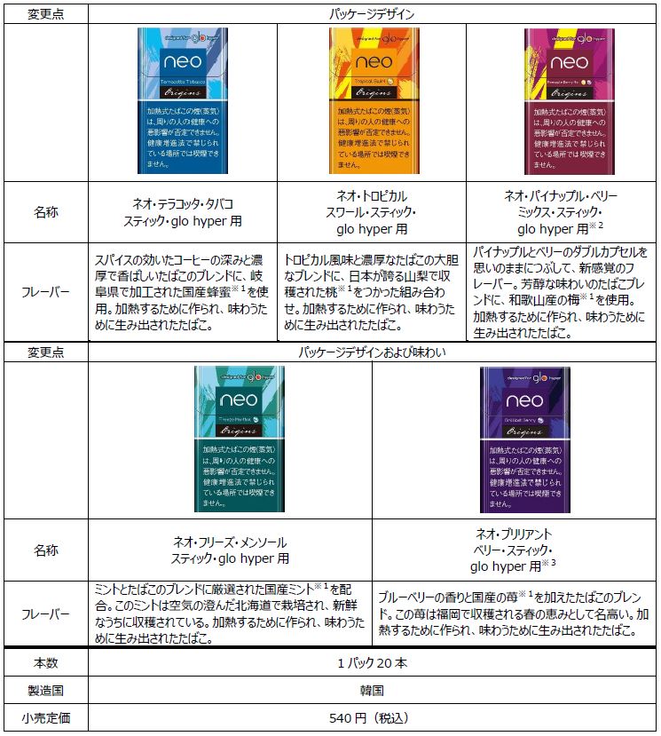 加熱式たばこglo(TM)専用たばこスティック「neo(TM)」の全5銘柄が5月中旬(※1)より順次リニューアル
