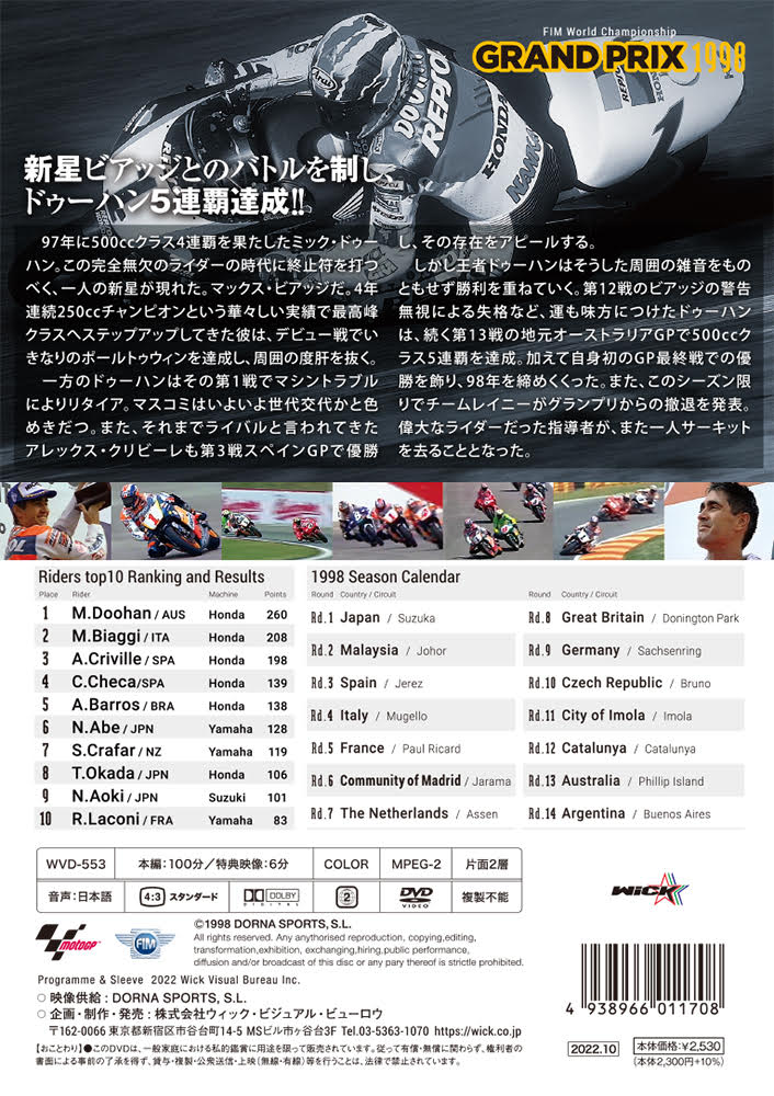 株式会社ウィック・ビジュアル・ビューロウは、GRAND PRIX 1998 総集編【新価格版】を2022年10月24日(月)より発売し、発売記念としてキャンペーンを実施すると発表した。キャンペーンの内容は、毎月発売される「Grand Prix総集編」各シーズンDVDケース内にある応募券を、3枚1口としてハガキで応募したユーザーにレジェンドライダー・アクリルフィギュアスタンドが当たるというもの。同アイテムは、新登場のバレンティーノ・ロッシ含め全8種(2024年6月まで実施)。DVD価格は2,530円(税込)、書店、バイク用品店、メーカー直販で購入可能だ。