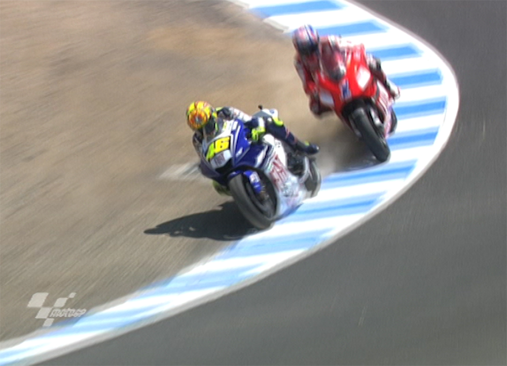開幕戦はGP史上初となるナイトレースが行われ、まずはストーナーが優勝し、第2戦ではダニ・ペドロサが勝利した。そしてルーキーながら開幕3連続ポールを獲得したホルヘ・ロレンソが第3戦で初優勝を達成すると、この年からタイヤをミシュランからブリヂストンに変更したバレンティーノ・ロッシが第4戦で優勝を果たし、以降3連勝を決め勢いに乗っていく。対するストーナーも第8戦から3連勝と対抗するが、第11戦アメリカのラグナ・セカで歴史に残るバトルを演じたロッシの術中にハマったかのようになり、ロッシは5連勝を達成し日本で8回目、最高峰クラスでは6回目のタイトルを獲得した。