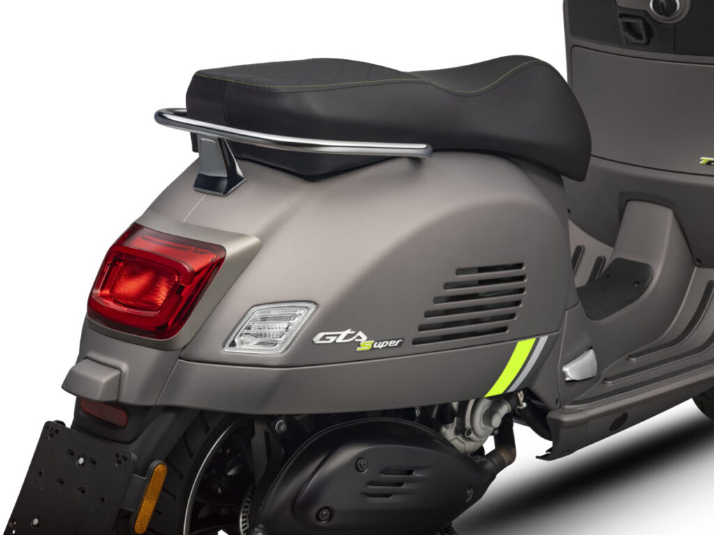 GTS 150 Super は、コンテンポラリーな印象を漂わせつつ、トレンドと伝統をアクセントに加えたデザインに仕上げています。特にグラファイトカラーのホイールはダイヤモンドカット仕上げで、パイピング付きシートが際立ちます。ボディカラーはグロッシーなイノチェンツァホワイトとパッショーネレッドの 2 色展開となっています。多数のクロームメッキパーツとグリップラバー、フットボードラバー、フロントサスペンションのスプリングなどのスポーティなブラック仕上げのパーツが組み合わされています。