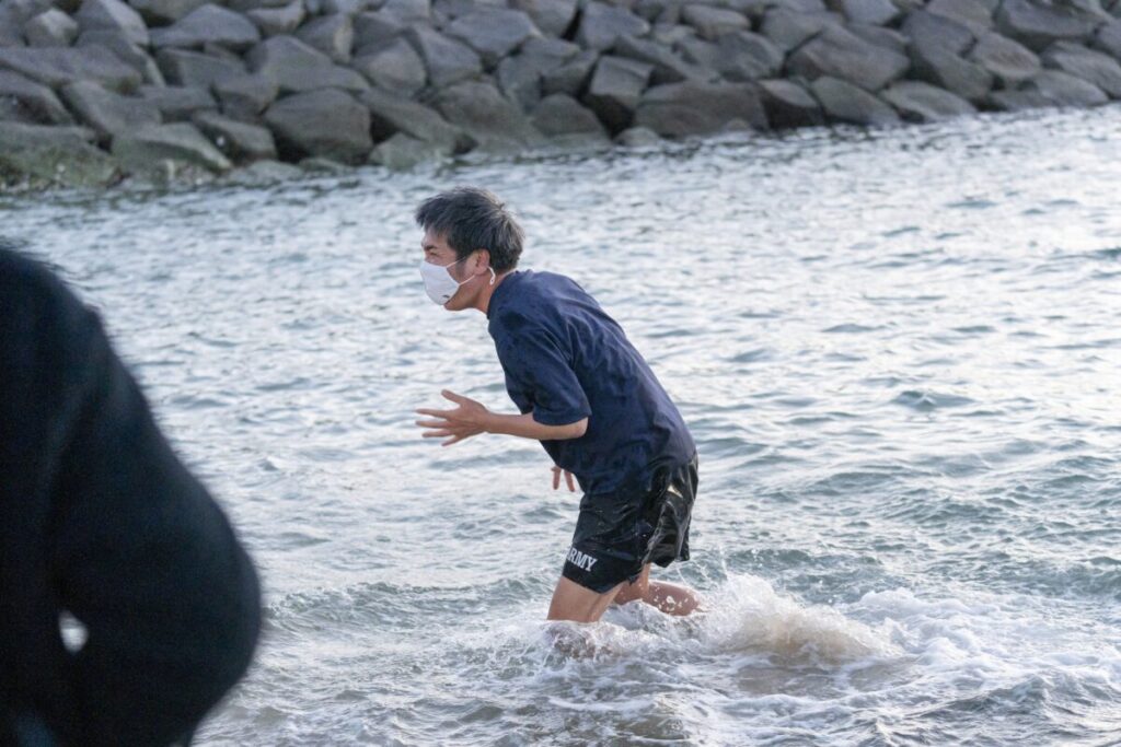 ◆大寒波襲来のさなか、海に飛び込み小木、絶叫!