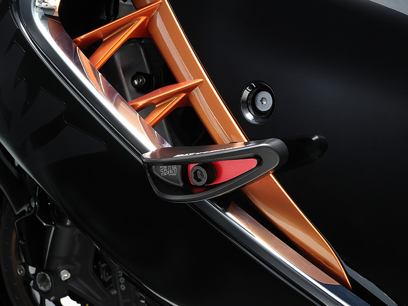 レーシングスライダーKIT“PRO SHIELD”は、ヨシムラレーサーに採用されたスライダー部品の技術とデザインをフィードバック。ストリートからワインディング、サーキット走行時における転倒時に、衝撃緩和や滑らせる効果によりシャーシ損傷のリスクを軽減します。