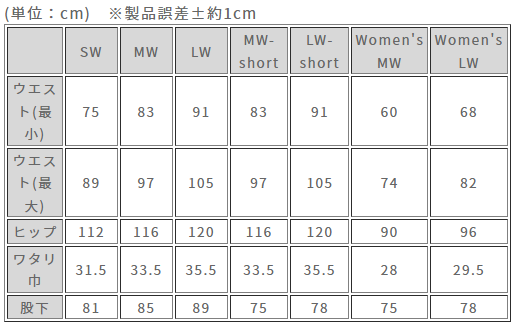 MW-short(30-36inch、股下70-76cm)、LW-short(34-40inch、股下73-79cm)