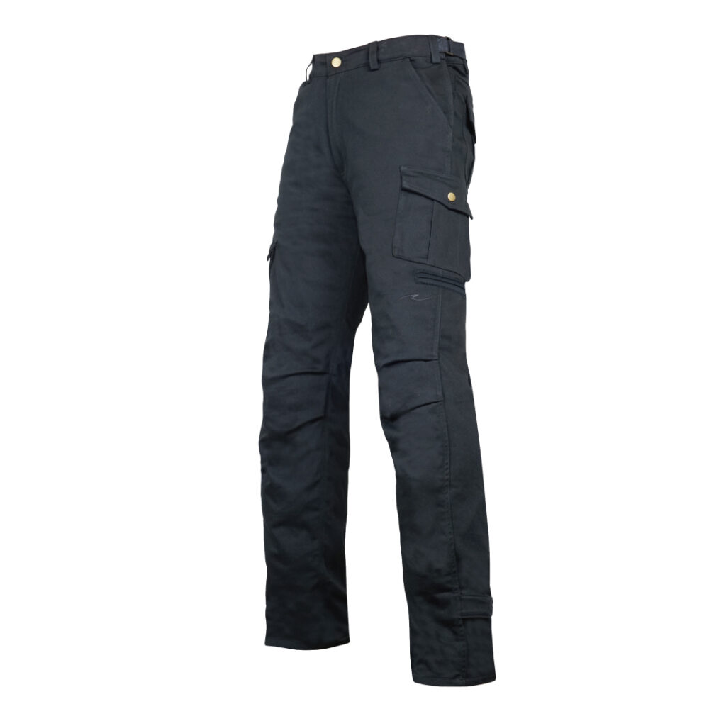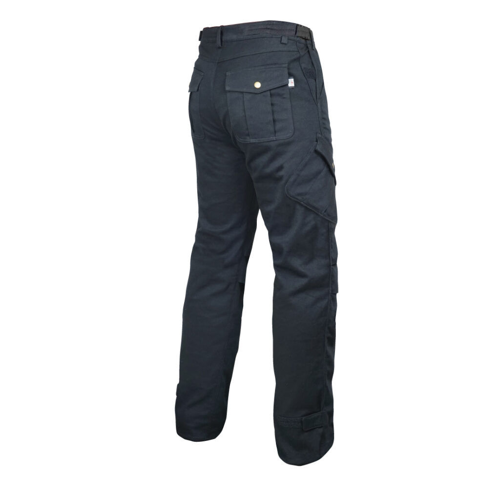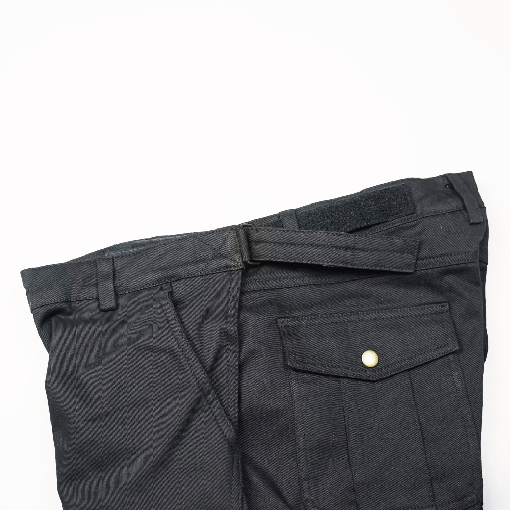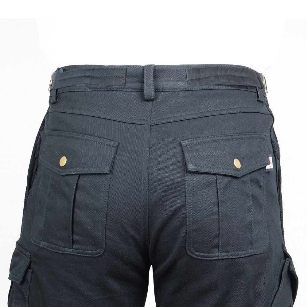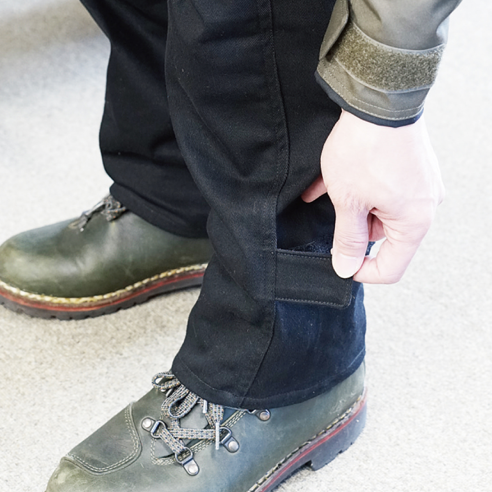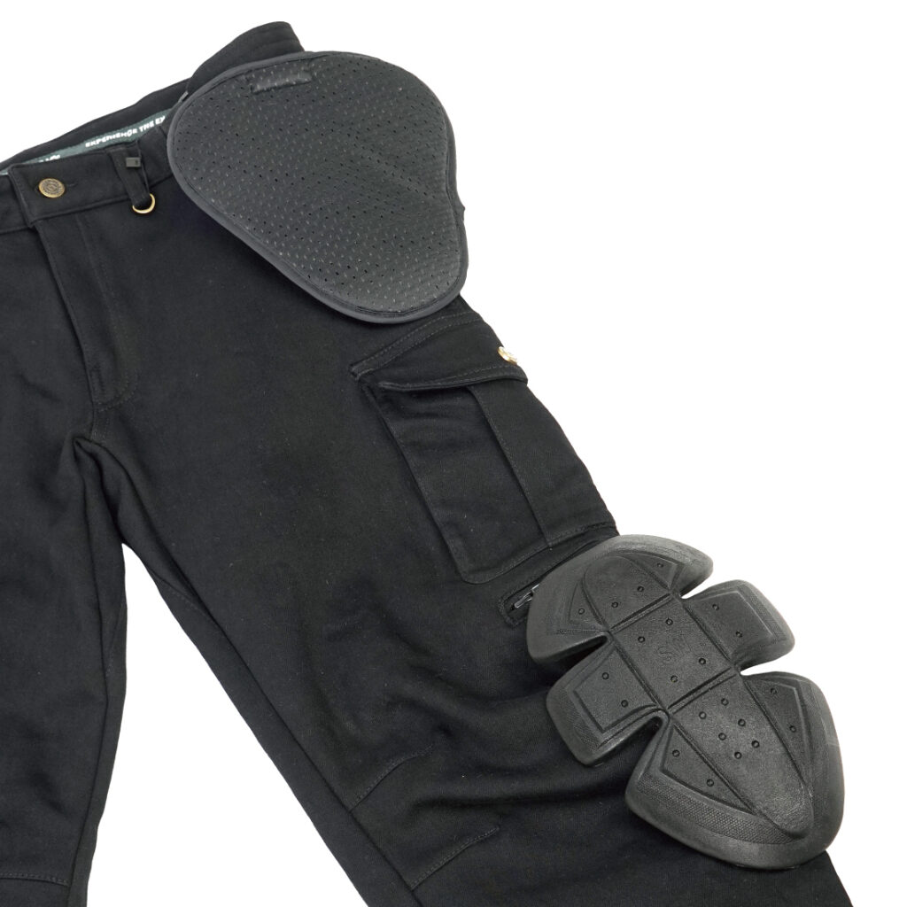 腰、膝には脱着式プロテクターを標準装備、右腿のポケットはステップに足を載せたままでの使い勝手のよいオフセットしたバイカー仕様。