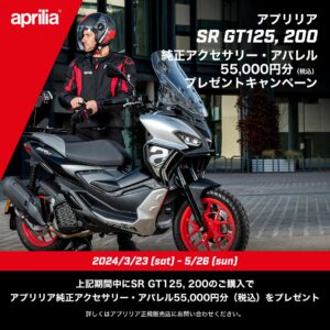 キャンペーン内容 : 期間中にキャンペーン実施販売店にてアプリリアをご試乗の方が、期間中に