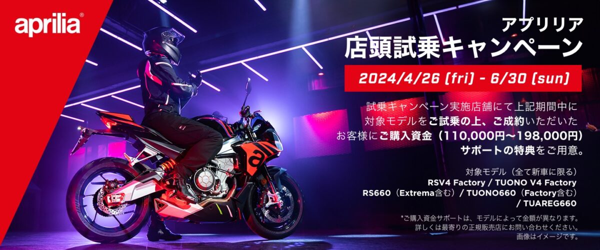 ピアッジオグループジャパン株式会社 (本社:東京都港区芝 2 丁目、代表取締役 ネリ・ミクラウス)は、スタイリッシュでスポーツマインドあふれるデザインは勿論、本物志向の走りと楽しさを両立させたアプリリアのスポーツバイクの魅力をご体感いただける試乗キャンペーンを、2024 年 4 月 26 日(金)から 6 月 30 日(日)まで、アプリリア正規販売店のうちキャンペーン対象店舗にて実施いたします。