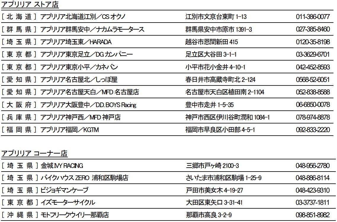 実施店舗 : 全国 26 のアプリリア正規販売店 (参加店舗一覧をご参照下さい)