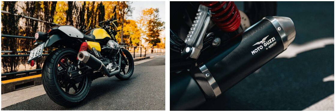このサイレンサーキットは、公道走行に必要な基準をクリアし、車検対応のエキゾーストシステムです。ブラックを基調としたサイレンサー部には MOTO GUZZI のイーグルマークと、製造元である ARROW のロゴを配した美しい仕上がりを誇ります。先に販売を開始した V7 Stone CORSA にも装着が可能で、さらにスポーティな外観と走りを演出します。