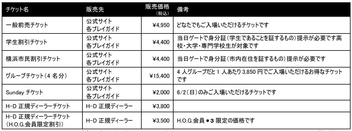 一般前売チケット(4,950 円/税込)に加え、横浜市民および学生を対象にした割引チケット(各 4,400 円/税込)、4 人グループだとお得になるグループチケット(15,400 円/税込。1 人あたり 3,850 円)を、チケットペイ・チケットぴあ・ローソンチケット・イープラス・Peatix にて、お買い求めいただけます。なお保護者同伴の中学生以下は入場無料となります。また全国のハーレーダビッドソン正規ディーラーでは、さらにお得な料金で、チケットをお買い求めいただけます。