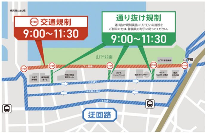 コース: 山下ふ頭 特設会場~山下公園通り (下図の赤い網掛け部分が公道走行ルートです。交通規制あり)