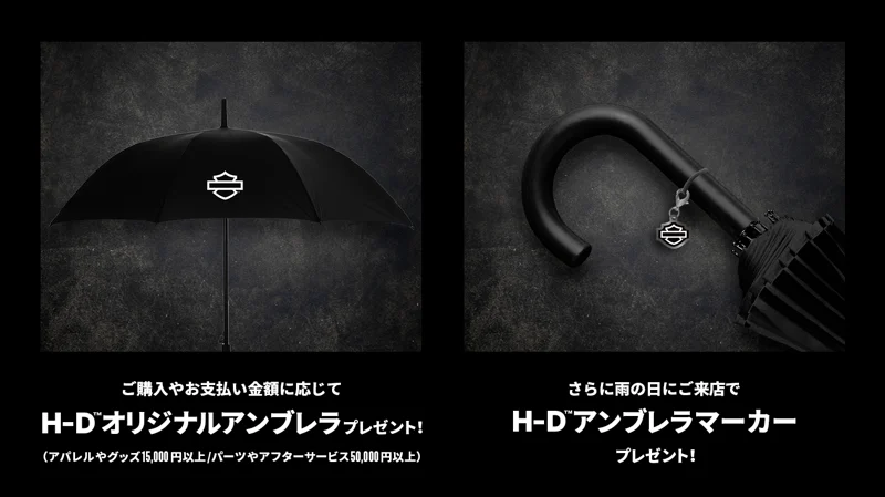 さらに期間中にハーレーダビッドソンのアパレルまたはグッズを15,000円以上、またはパーツ&アクセサリご購入・各種アフターサービスご利用額が50,000円以上のお客さまには「H-D™ オリジナルアンブレラ(傘)」(写真左)も、合わせて進呈いたします*2。
