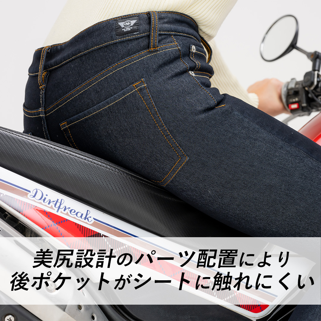 バイク乗車時に後ポケットに物を入れる事はほぼ無いとは思いますが、後ポケットの厚みが気になりライディングの妨げにならない様に設計されています。