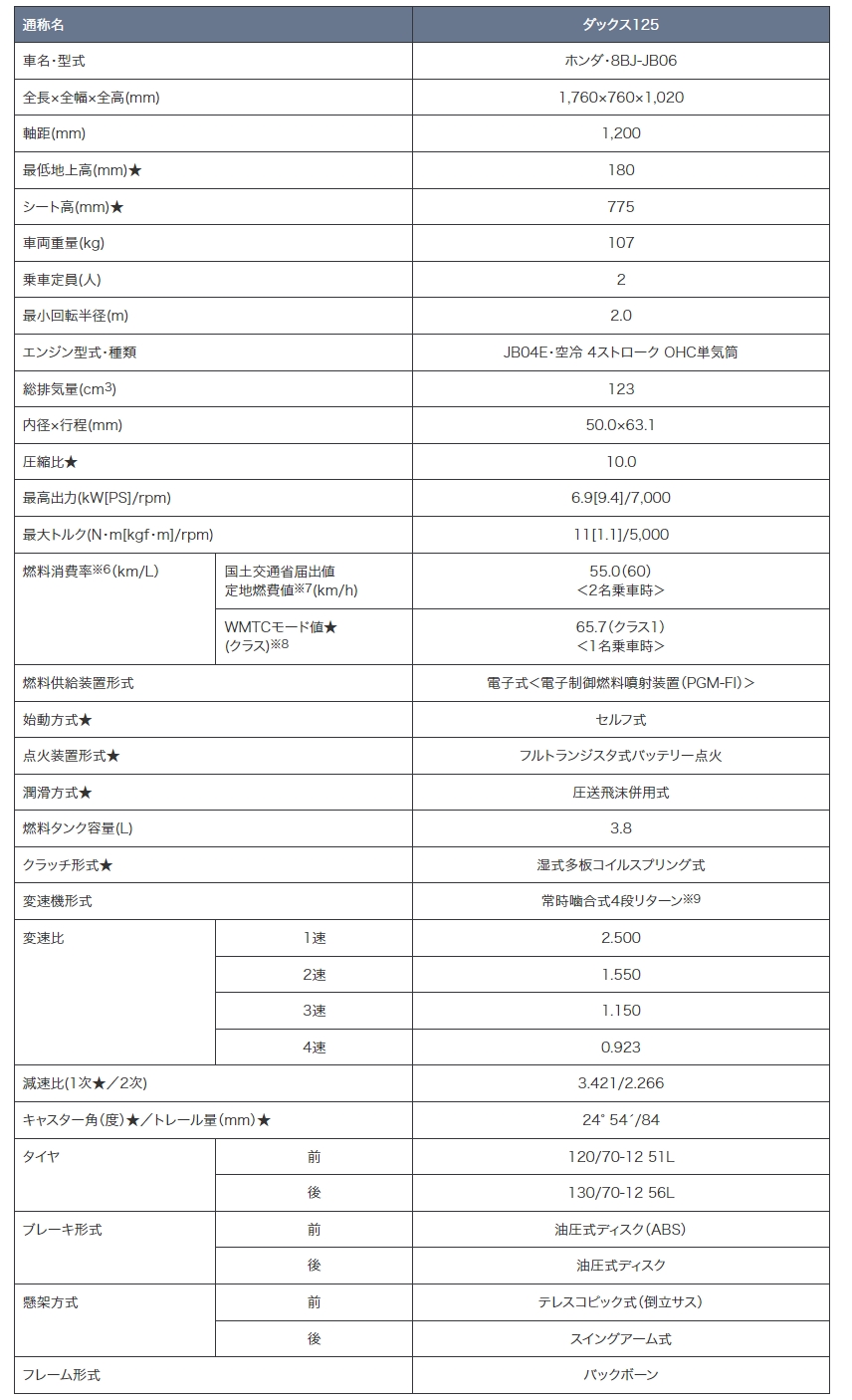 ■道路運送車両法による型式認定申請書数値(★の項目はHonda公表諸元)