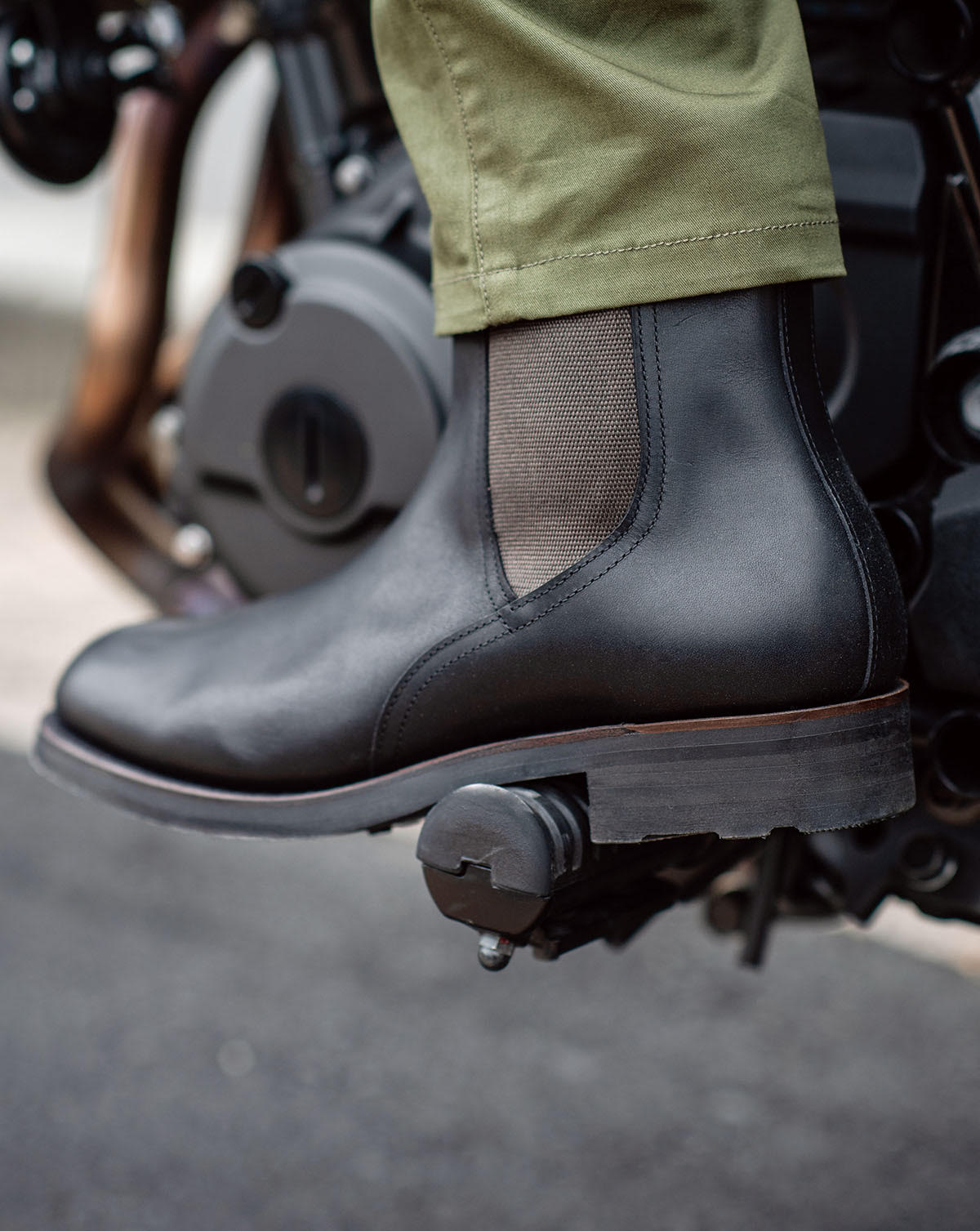 同製品は、二重構造のサイドゴアに牛革製アンクルパッドを内蔵することにより、デザインをスポイルする事なく安全なライディングをサポート。歩きやすさと品質にこだわり抜いたエレガントに履けるバイクブーツとなる。